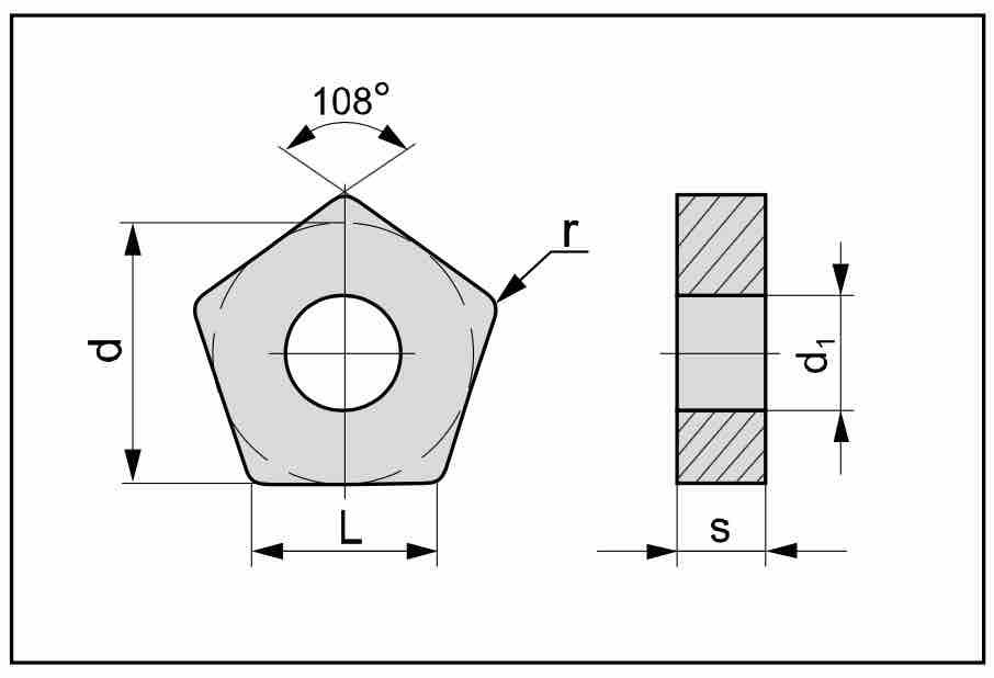Твердосплавные пластины пятигранной формы с отверстием и стружколомающими канавками.