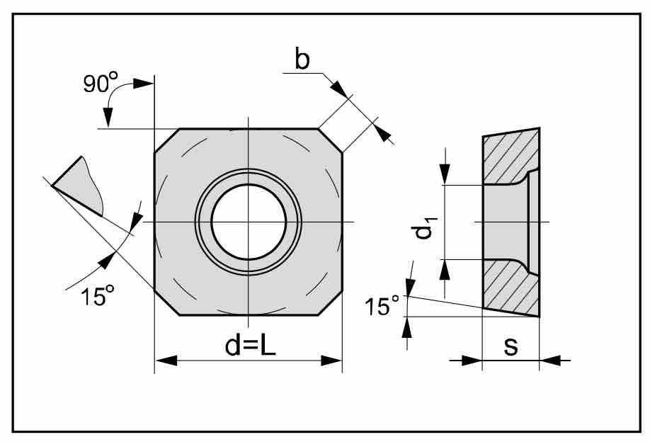 Твердосплавная пластина квадратной формы с тороидальным отверстием. c задним углом 15 градусов, с симметричными фасками при вершине