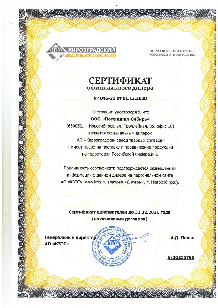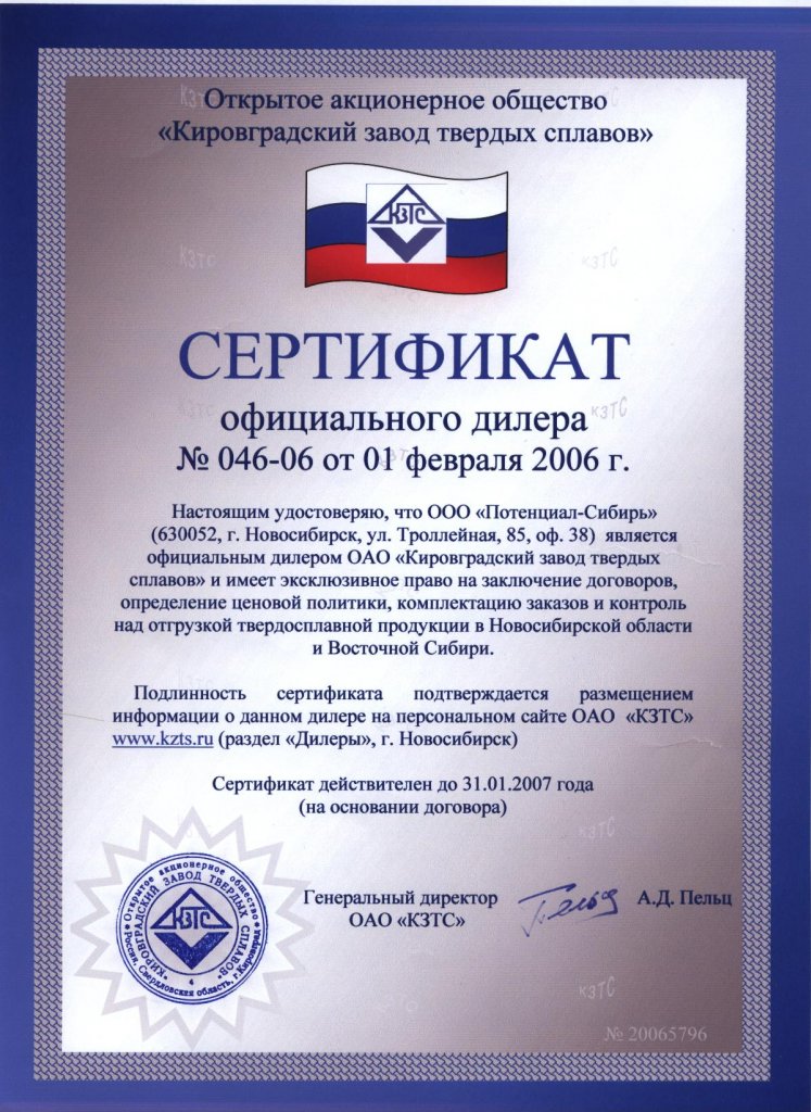 ООО «Потенциал-Сибирь» является официальным дилером ОАО «Кировградского завода твёрдых сплавов» в Новосибирской области с 2003 года.+